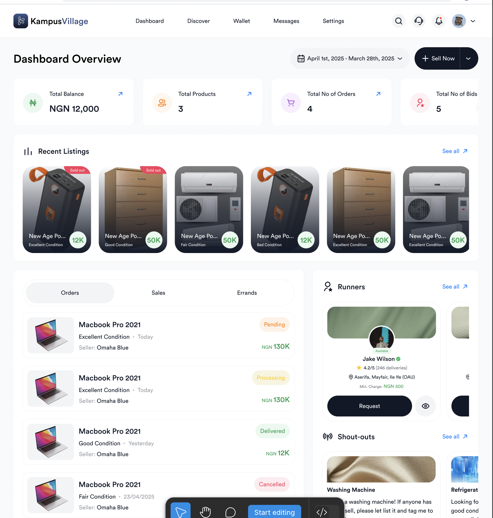 KampusVillage is a one-stop app where students buy, sell, and trade used goods, find books, roommates, jobs, and even shout out for what they need to buy. It accommodates Vendors, Runners and Artisans.